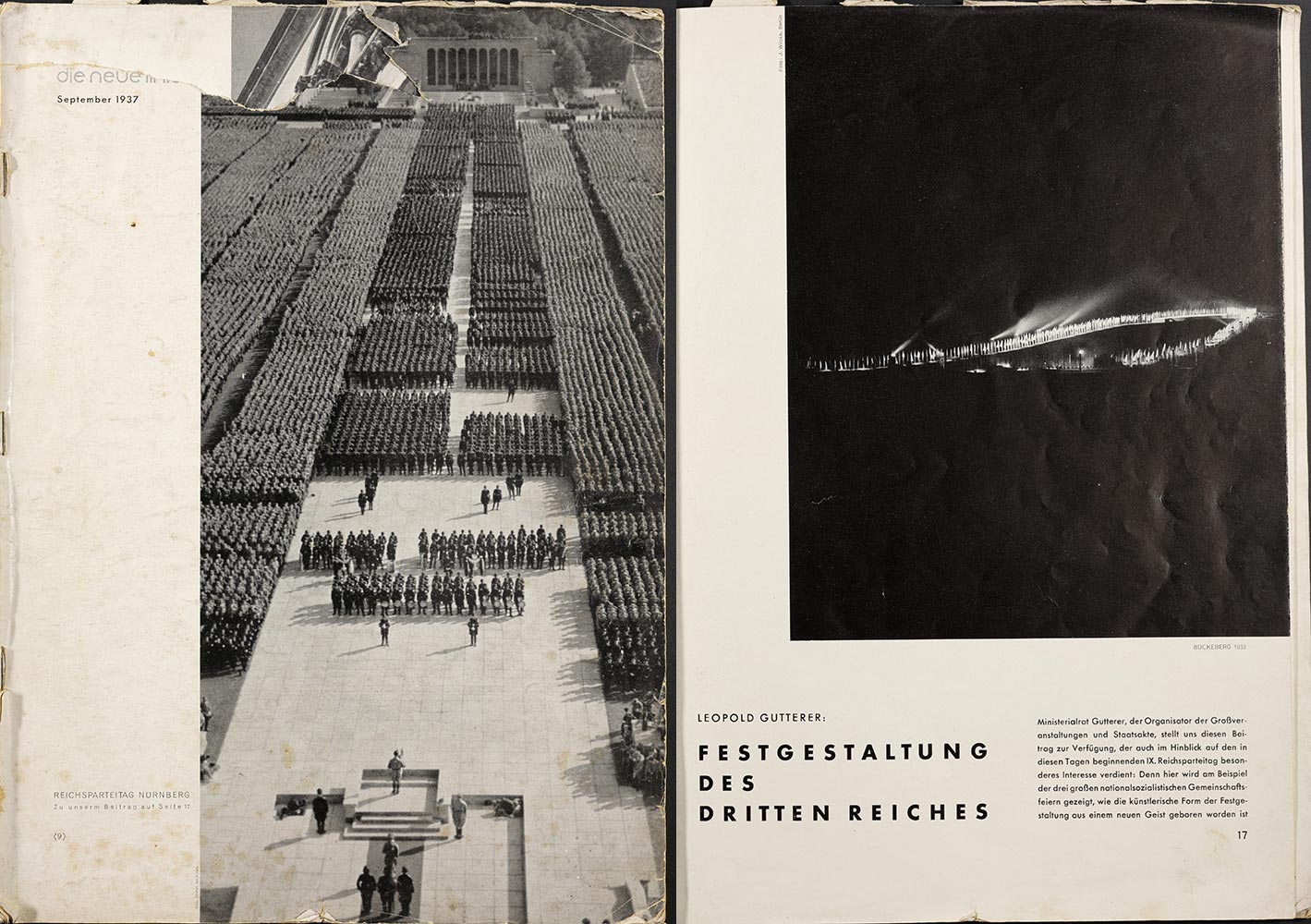 Nürnberg kommt immer wieder als Orientierungspunkt, Reiseziel oder Ort nationalsozialistischer Feiergestaltung in der Zeitschrift die neue linie vor. Im September 1937, wieder im Monat des Reichsparteitags, stellt der Ministerialrat Leopold Gutterer die "Festgestaltung des Dritten Reiches" anhand des Reichserntedankfestes auf dem Bückeberg und der Reichsparteitage dar. Während die Feier auf dem Bückeberg dem angeblichen germanischen Brauch folge, in freier Natur eine Feierstätte zu errichten, werde für die Reichsparteitage, so Gutterer, eine Architektur der "Volksgemeinschaft" geschaffen, "bei der jeder sich selber als Teil einer schaubaren Architektur" (S. 18) empfinde "mit einer Blickkonzentration auf den Platz des Führers" (S. 23).