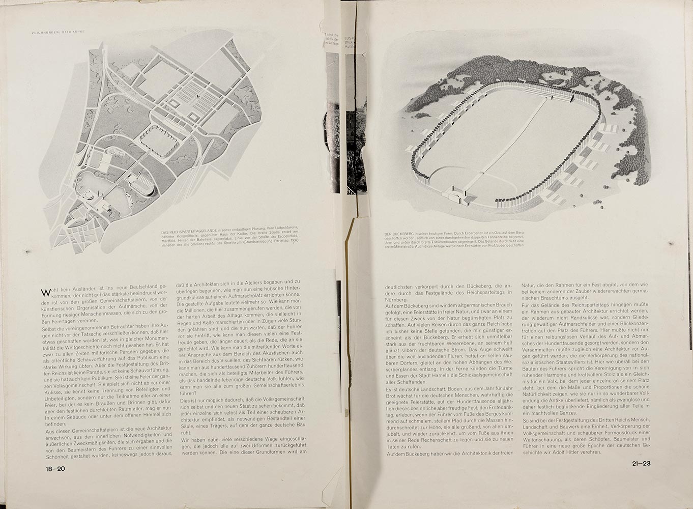 Nur im September 1938 schafft es Nürnberg mit dem Reichsparteitagsgelände auf die Titelseite der Zeitschrift. Begleitet wird diese Aufmachung durch einen Text des expressionistischen Dichters Rudolf Adrian Dietrich mit dem Titel "Nürnberg – Sendung einer deutschen Stadt", der in neunzig Prozent seines Beitrags das spätmittelalterliche Nürnberg vorstellt. Illustriert ist der Beitrag mit eigens angefertigten Zeichnungen vom Stadtbild und den Häusern der Altstadt von Gerda Rotermund, gleichfalls eine namhafte Künstlerin aus Berlin. Sie zeichnet auch Kongresshalle, Märzfeld und Deutsches Stadion. Diese "Großbauten des Dritten Reiches" stellt Rudolf Adrian Dietrich in die Traditionen der alten Reichsstadt Nürnberg "als schon in den Wurzeln ihrer frühesten Vergangenheit beschlossen". (S. 45). "Wie ehedem", so Dietrich weiter, "entstehen auch Nürnbergs neue Bau- und Kunstdenkmäler wieder aus dem Geist der politischen Sendung dieser deutschen Stadt". (S. 45)