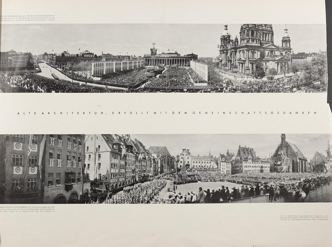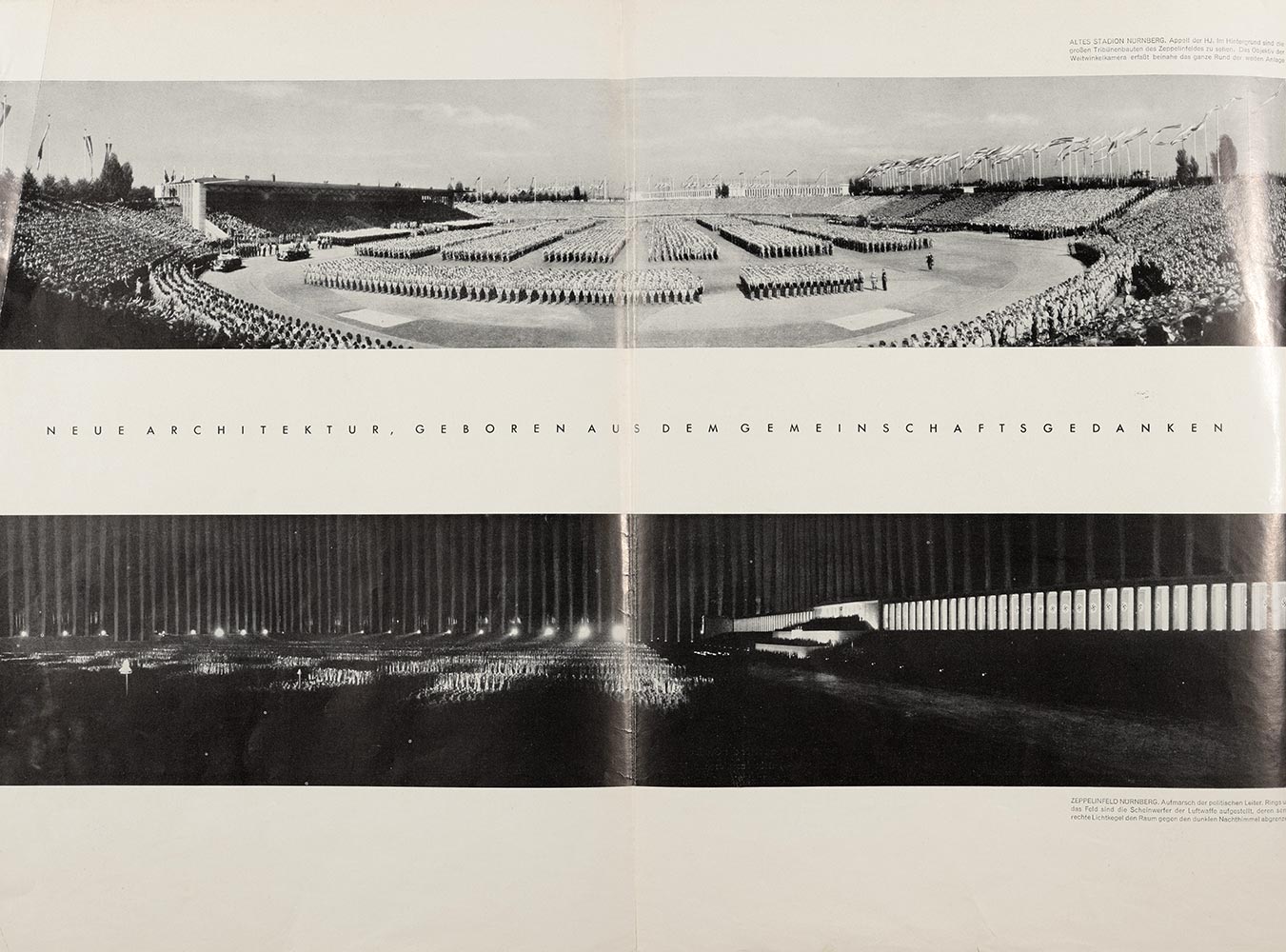 Illustriert wird diese sehr einfache ideologische Interpretation von Feierräumen durch ausklappbare Panoramafotos, welche die Festräume insgesamt als geschlossenes Ensemble einer Gemeinschaft zeigen sollen. Zu sehen sind das Zeppelinfeld mit dem Lichtdom, das Nürnberger Stadion beim Tag der HJ und der Nürnberger Hauptmarkt beim Vorbeimarsch nationalsozialistischer Formationen an Adolf Hitler. Die Fotos wurden mit einer eigens konstruierten Panoramakamera extra für die neue linie angefertigt, um das gesamte Rund der Platzanlagen zu erfassen.