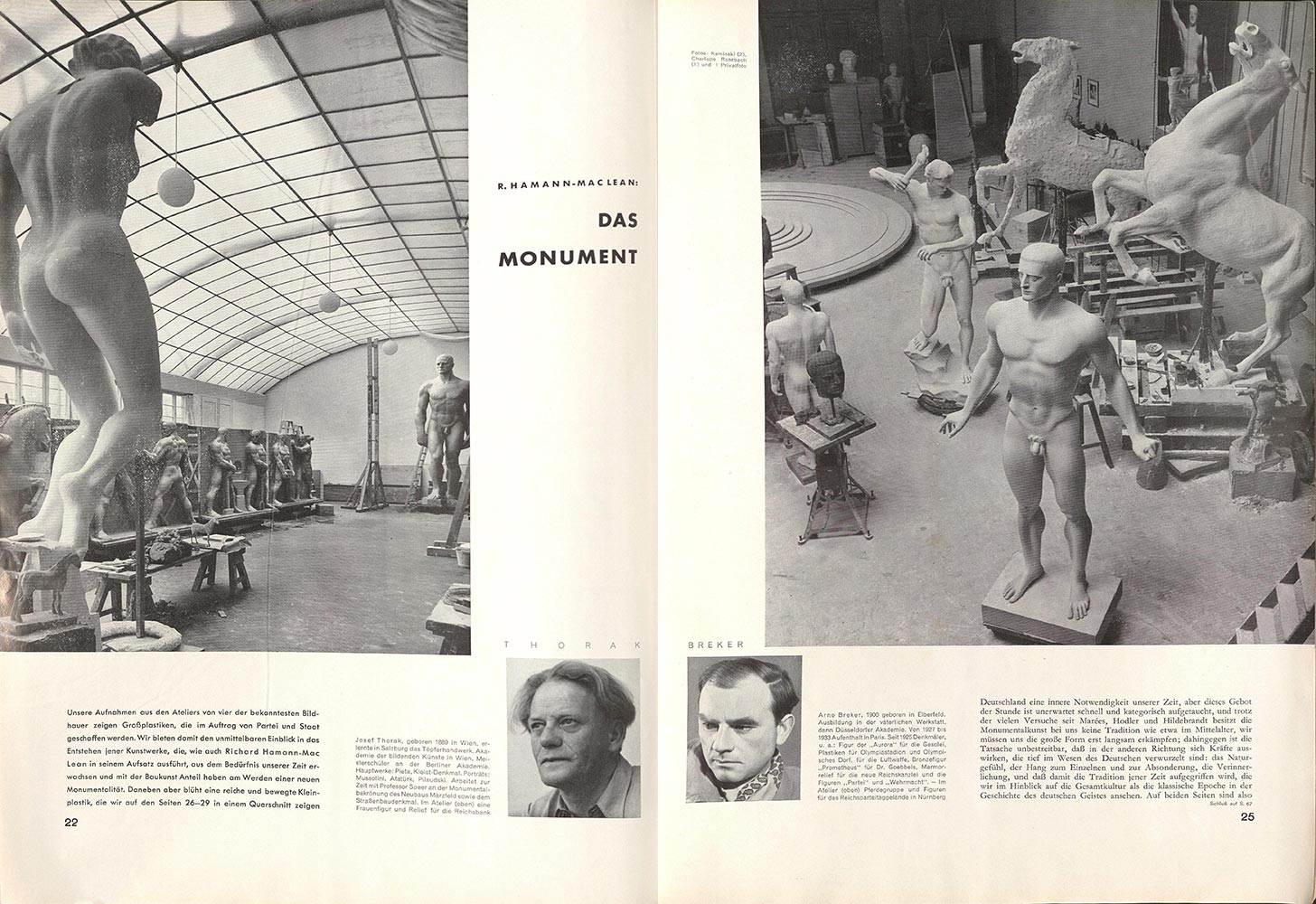 Im Sommer 1939 führt die neue linie ihre Leser und Leserinnen in die Ateliers von vier Künstlern, die Monumentalplastiken für Bauten und Plätze herstellen. Bei Joseph Thorak und Arno Breker sind jeweils Arbeiten für das Reichsparteitagsgelände zu sehen, in Thoraks Atelier in Baldham bei München die riesenhaften Figuren für die Haupttribüne des Märzfeldes.