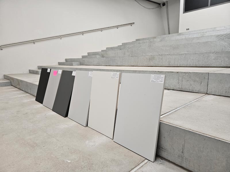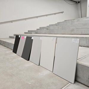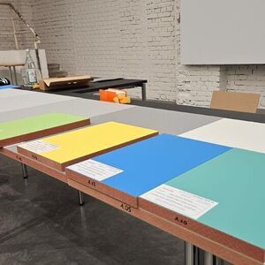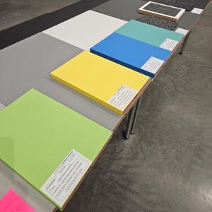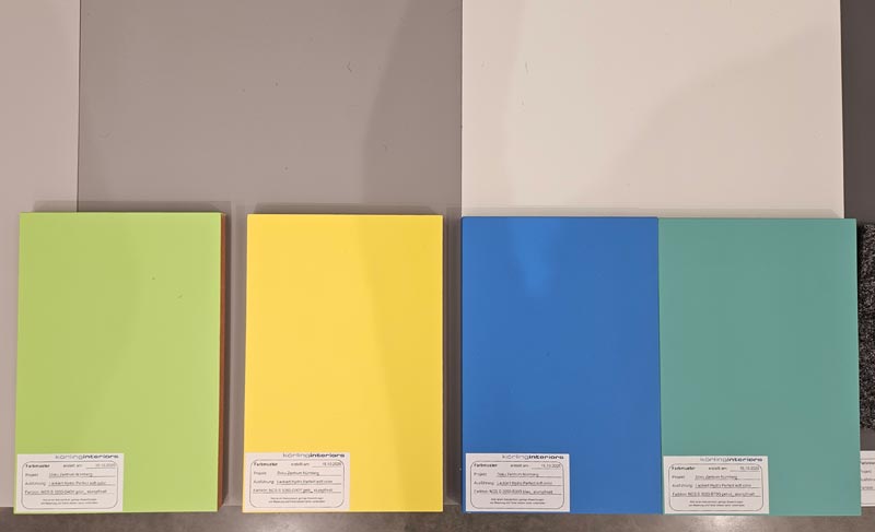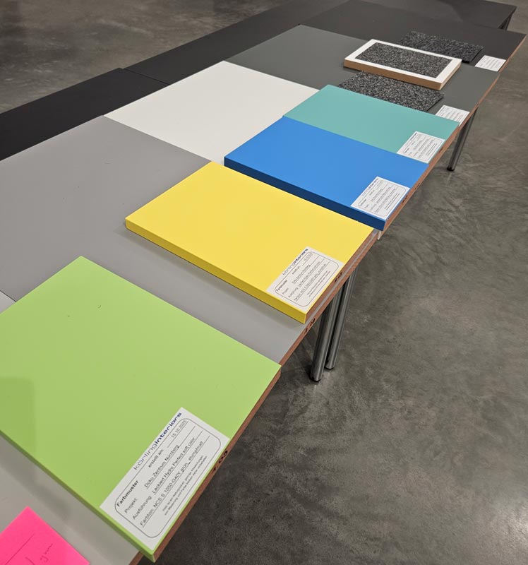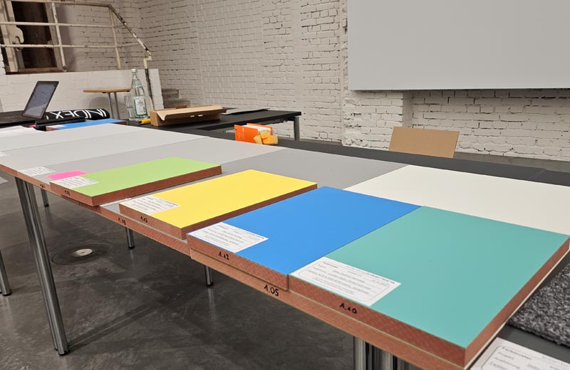 Unsere neue Dauerausstellung wird farbig! Wie aber die Farben, die wir bisher nur in den Grafikentwürfen am Monitor betrachten konnten, in Realität wirken – das haben wir mit unseren Gestaltern vor Ort getestet. Zu beachten sind dabei die Lichtverhältnisse, der Druck und das Zusammenspiel unterschiedlicher Materialien. Grau ist eben nicht gleich Grau, und Grün nicht gleich Grün...